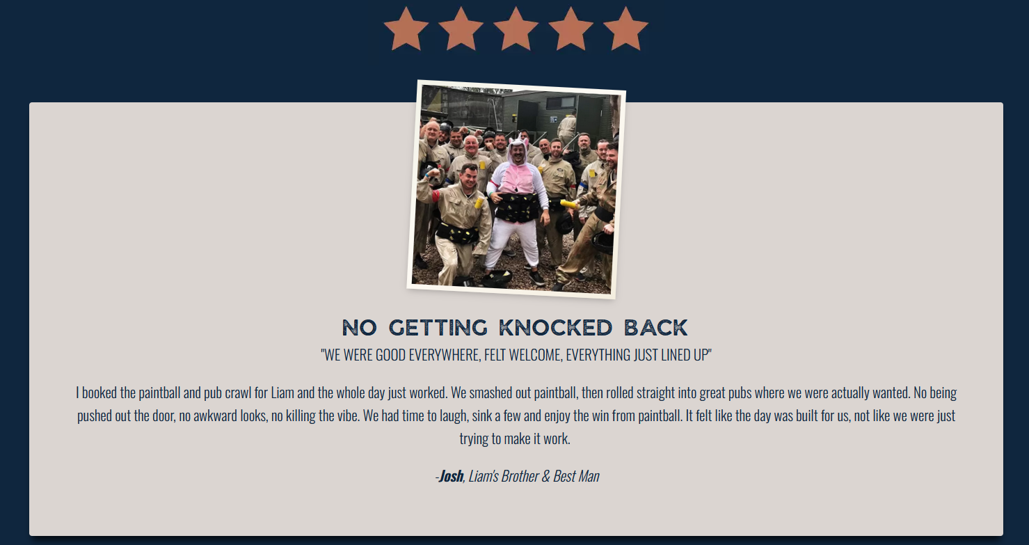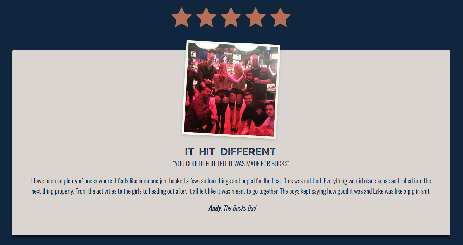 This is not luck. It is the result of running bucks parties exclusively for years and building everything in-house.